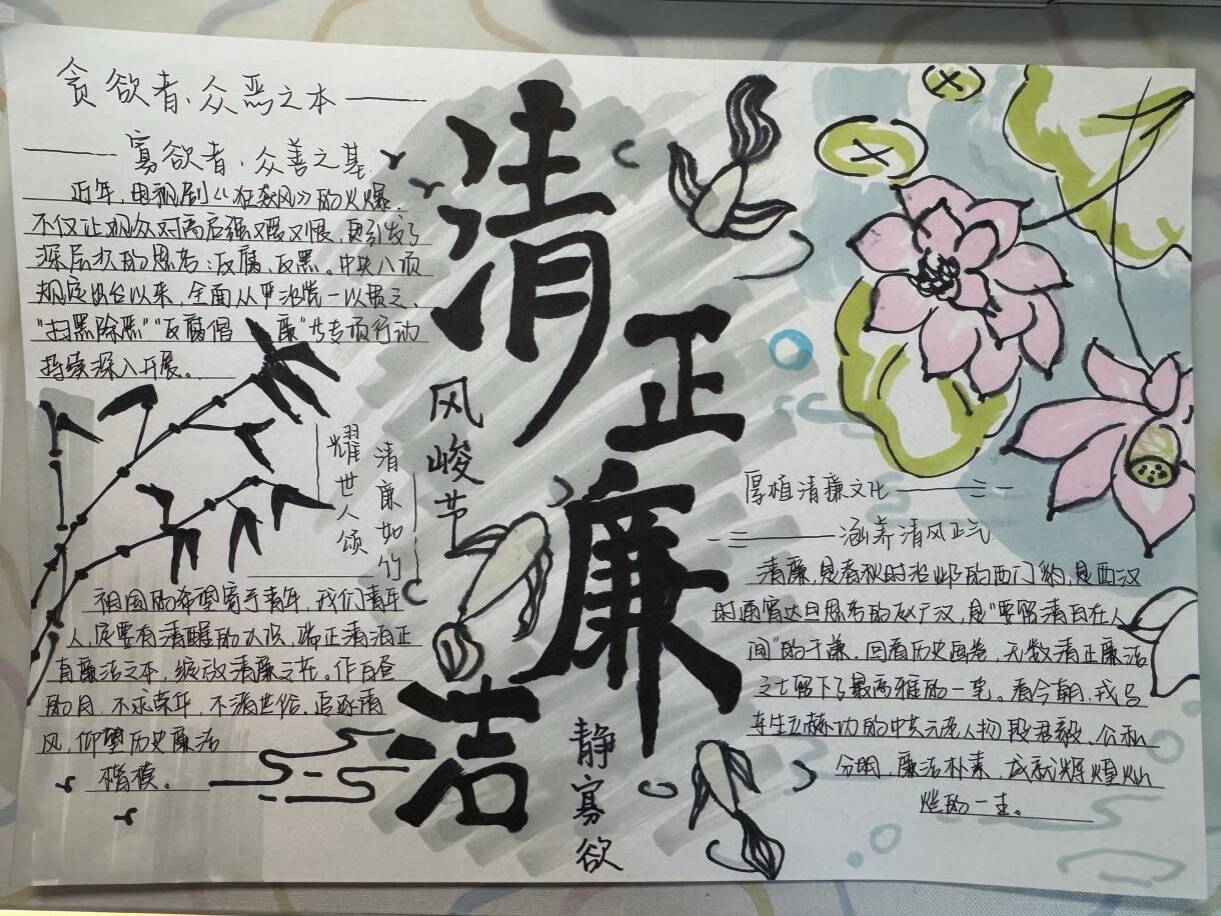活动中,学生党员们紧扣清廉学校建设的主题,通过手抄报、征文等形式,结合自身的学习、工作和生活经历,以真挚的情感和深刻的笔触阐述了对清廉学校建设的理解与感悟。学生作品内容多样,既有对廉洁奉公高尚品德的颂扬,也有对身边廉洁事迹的生动叙述,更有对如何在校园中践行廉洁理念的深入思考。