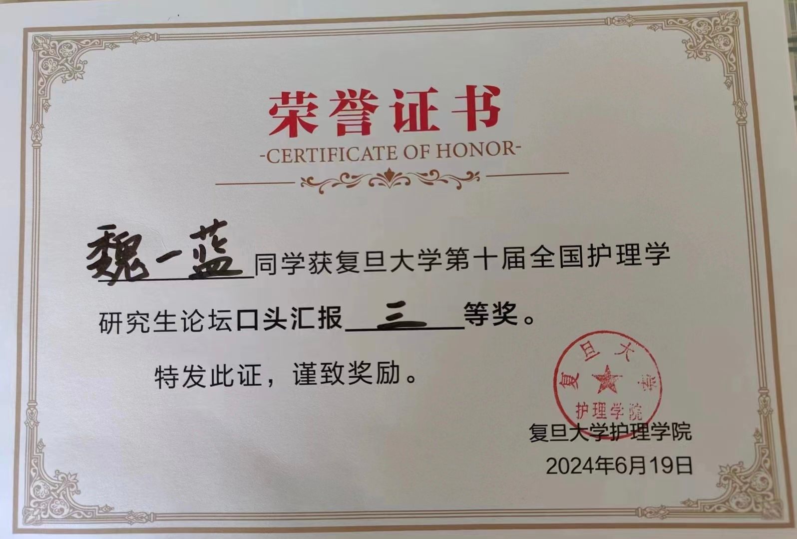 研究生魏一蓝做学位论文《重症监护室护士的心理负荷及发生机制:基于眼动的证据》(导师张爱华)汇报,获口头汇报三等奖。
