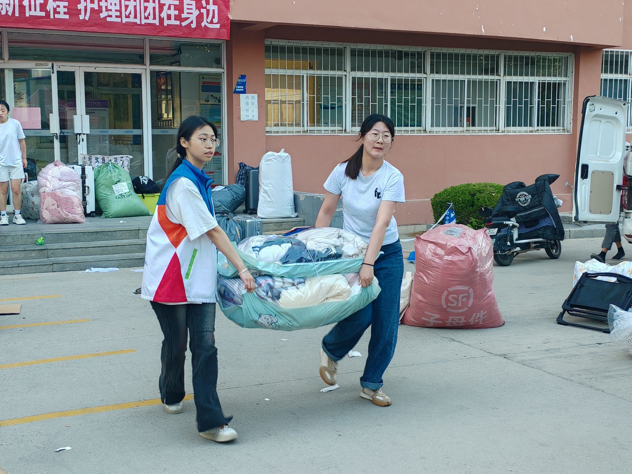 在这里,21级的同学们将大学校园生活暂时存档,挥别过去,迎接实习生活的新篇章。而志愿者们则像一群勤劳的蜜蜂,进进出出,不辞辛劳地忙碌着。他们接过手中的行李,犹如接过了一份“新的传承”。这不仅仅是简单的送别,其中有不舍、有祝福,更意味着传递“最美护理”之薪火,续写护理学子芳华新篇章。