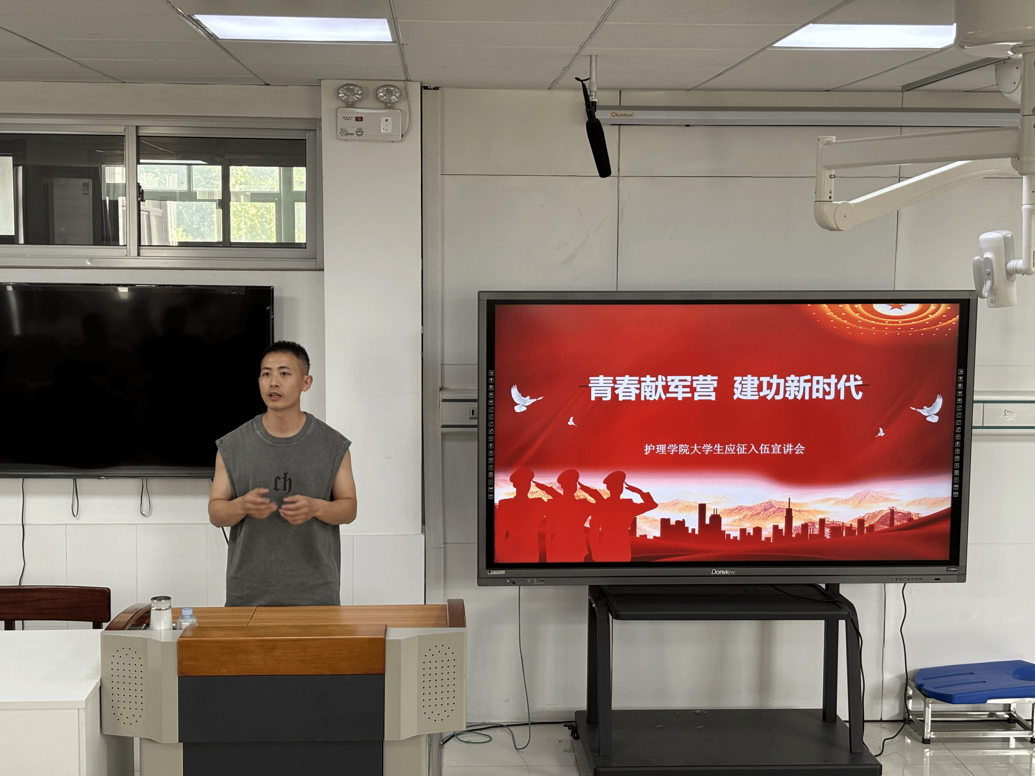 为激发广大护理毕业生学子参军报国的热情,承担起新时代青年保家卫国的责任和使命,近日,williamhill威廉希尔中文网站为2024届毕业生举办“青春献军营 建功新时代”征兵宣讲活动。学院组织员赵学超主持活动。