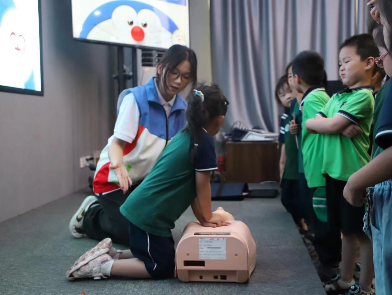 宣讲结束后,队员们用生动的语言为孩子们介绍了八字包扎、环形包扎等包扎方式及应用场景,还利用人体模型现场示范了心肺复苏的操作方法,详细讲解了每一个步骤,并鼓励孩子们亲自上前尝试。现场气氛热烈,小朋友们积极参与其中,纷纷表示这项活动既有趣又有益,令他们受益匪浅。