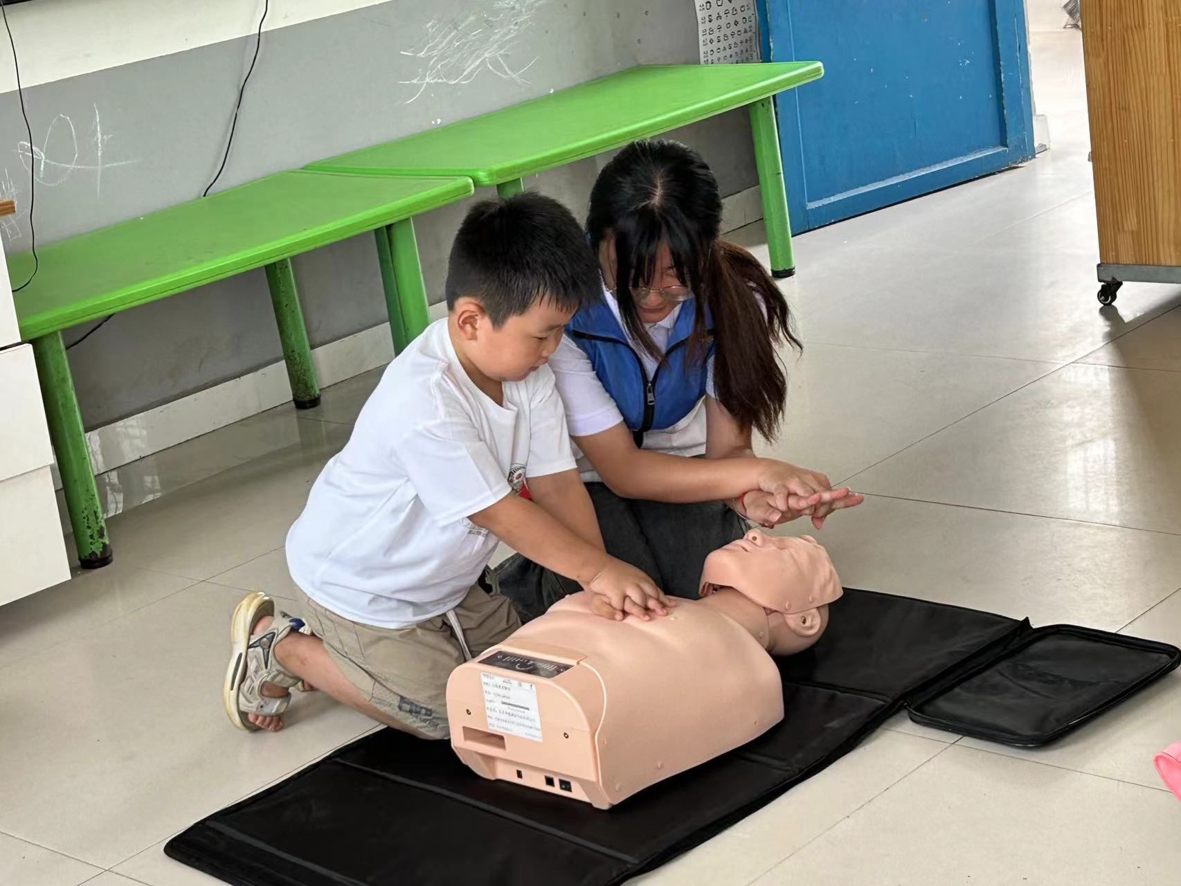 宣讲结束后,队员们利用假人模型,通过耐心讲解、亲身示范,为孩子们展示了心肺复苏术的标准流程。演示结束后,队员们邀请孩子们亲身体验,在实践中学习知识,并耐心地指导他们动作要点,直至动作能够标准规范。在一遍遍的纠正下,小朋友们对心肺复苏建立了初步的认知。