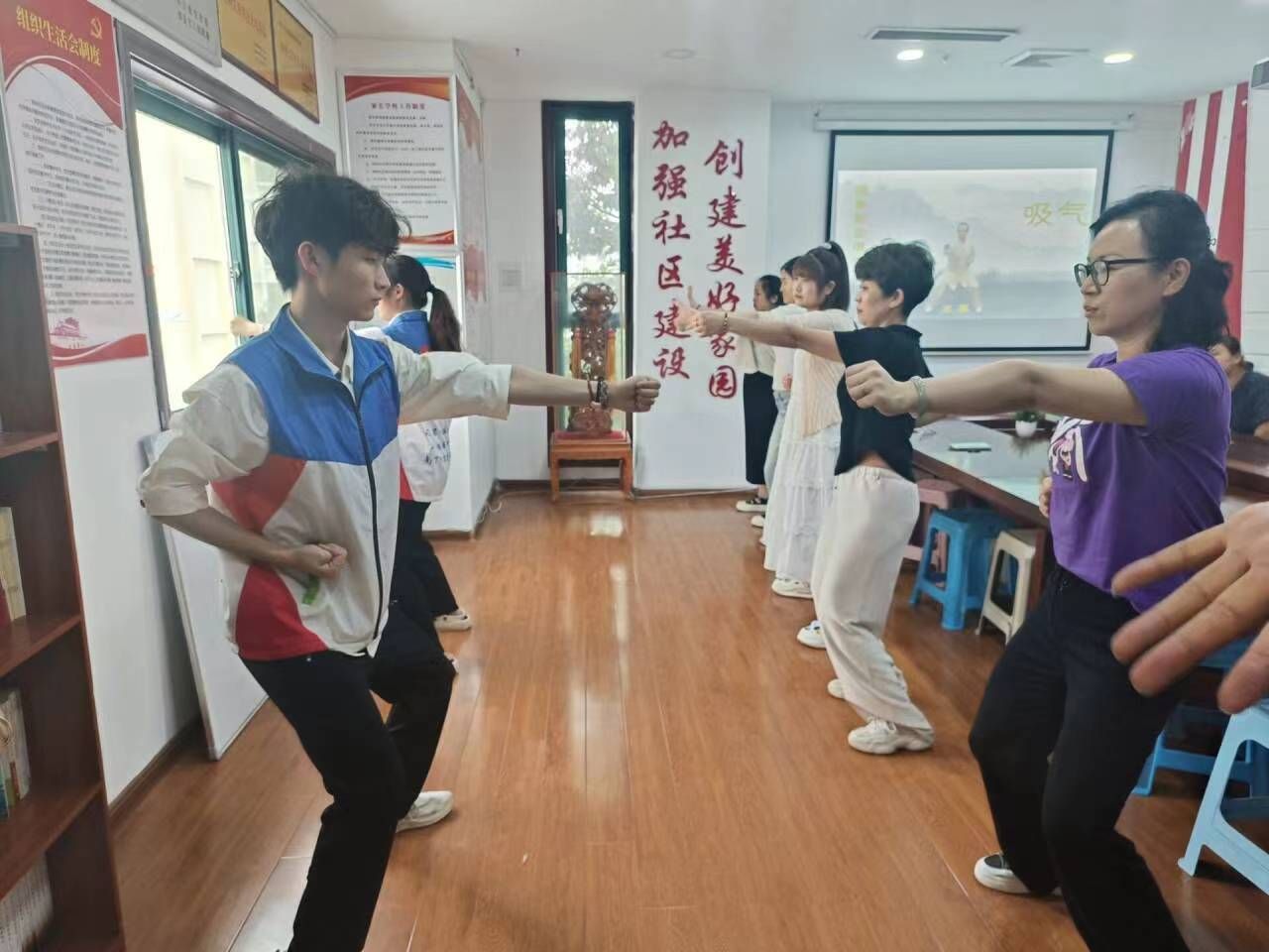 此外,志愿者们还开展了八段锦教学,通过详细讲解与标准示范,帮助居民们掌握八段锦的动作要领。八段锦作为一种传统养生健身方法,旨在通过协调意识、身体动作与呼吸节奏,达到身心和谐、防病强身的效果。居民们积极配合,在志愿者们的指导下认真学习、专心操练,现场氛围和谐而融洽。