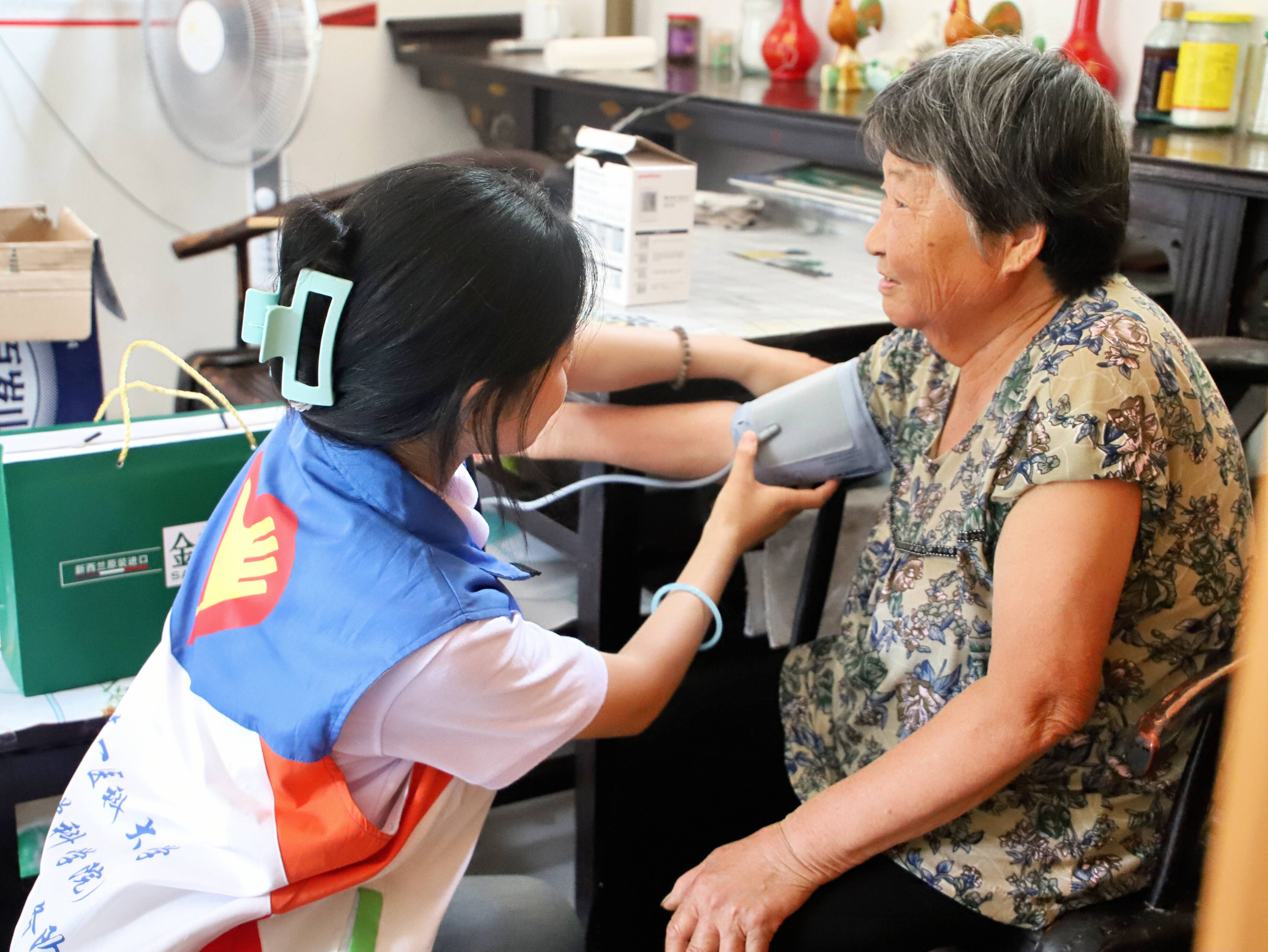护理学子进行入户慰问,看望生活困难的村民,为他们送去爱心物资,提供测量血压血糖、收拾庭院卫生等服务。