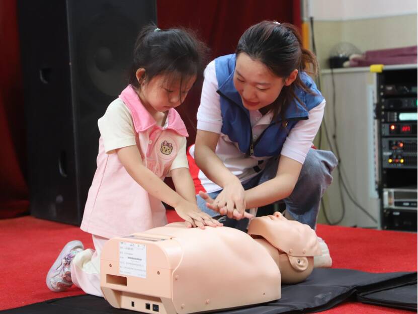 护理学子进行心肺复苏实操展示,孩子们在队员的悉心指导下依次尝试心肺复苏操作。