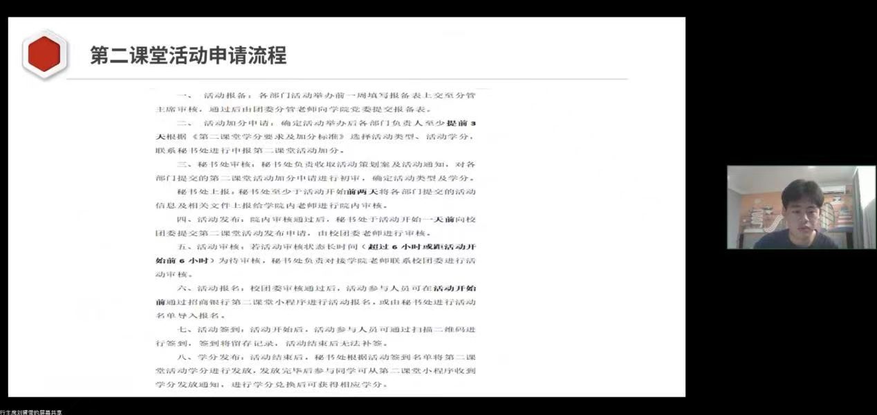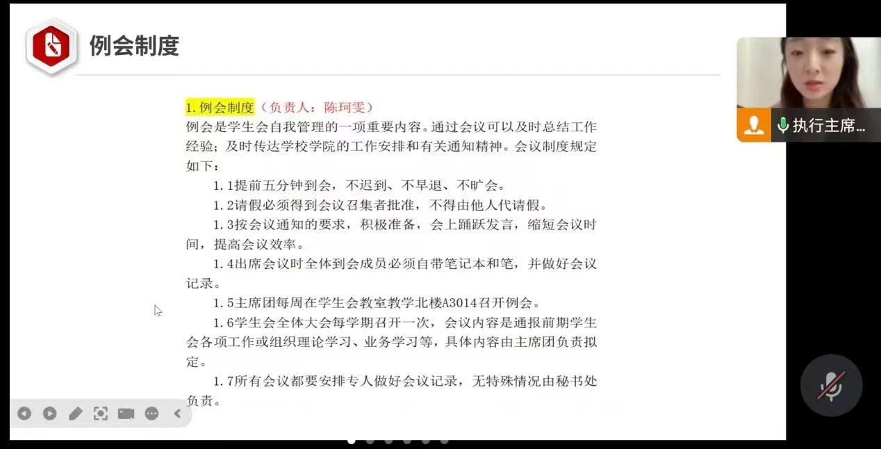 随后,学生会副执行主席韩秉宪、刘贇雪向全体学生干部详尽地介绍了第二课堂活动的申请流程、奖惩制度等关键性工作要求,其中重点阐述了学生会8月份的目标任务与工作重点,旨在为各部门的日常工作提供明确指导与方向。