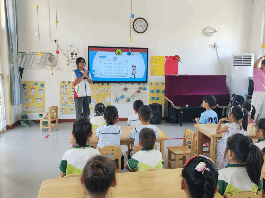 活动伊始,队员们结合精心准备的PPT,为小朋友们开展免疫防御的相关知识课程,通过深入浅出的讲解,向小朋友们介绍了流感的一系列症状。随后,队员们通过介绍结核传染流行病的特点,为小朋友们科普了甲流、乙流、水痘等疾病的传播途径及日常的预防方法。在教学过程中,队员们还十分注重课堂的趣味性与互动性,他们首先以提问的方式点燃了小朋友们的学习热情,然后借助生动有趣的动画片,在活跃课堂氛围的同时,也向小朋友们传递了提高免疫力的相关方法和知识。最后,队员为小朋友们演示了七步洗手法的标准流程,引导小朋友们树立勤洗手,讲卫生的健康意识。