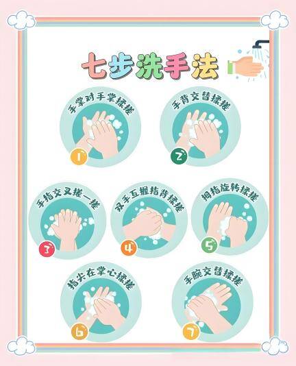 七步洗手法是一种用于减少手部细菌和病毒,预防疾病传播的洗手方式,可以简单归纳为“内、外、夹、弓、大、立、腕”七个步骤: