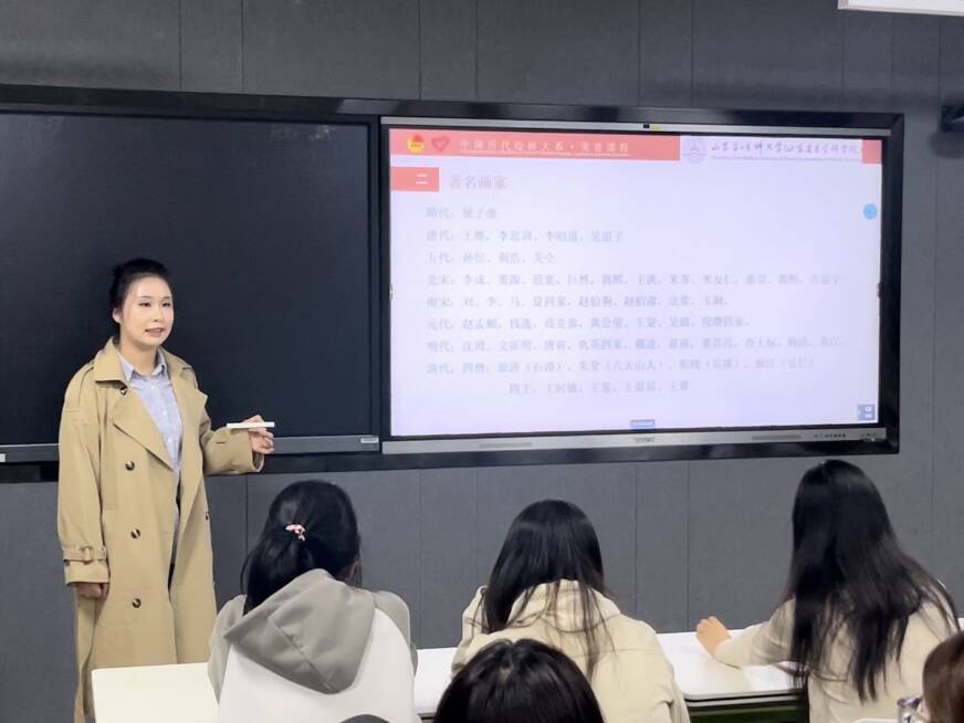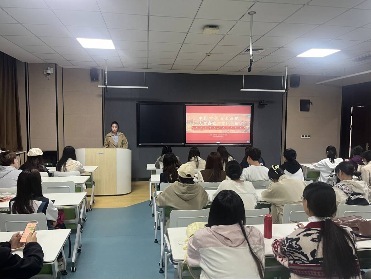 本次活动中,宣讲团成员充分利用多媒体资源,通过精心制作的PPT和视频影像,为观众带来了一场心灵与视觉的双重盛宴。通过一系列精美的演示材料,宣讲团成员生动地展示了中国古代山水画的无限魅力。他们从山水画的基本要素谈起,剖析了山水画如何通过笔墨技法、色彩与构图,传达出画家的情感寄托与哲思,进而揭示了其在中国文化史上的独特地位与深远影响。他们不仅介绍了山水画的发展,还着重讲解了不同历史时期山水画的风格变迁与山水画背后的人文寄遇,带领听众穿越时空,近距离感受那些流传千古的艺术佳作。活动过程中,同学们的参与热情高涨,纷纷就山水画中的人文情怀、技法创新以及艺术价值等问题与宣讲团成员展开交流,双方的交流不仅促进了知识的共享与深化,还营造了温馨融洽的互动氛围。