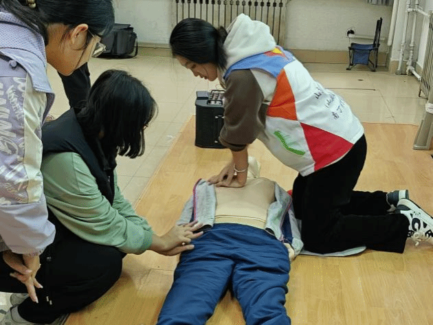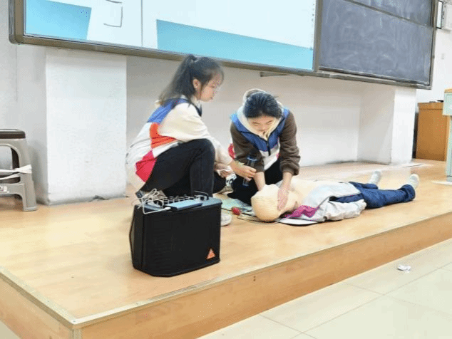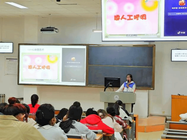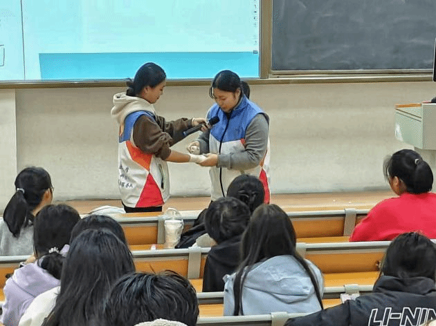 活动以急救技能宣讲及知识测试的形式开展。活动采取PPT、视频、动漫展示等方式向同学们展示包扎、心肺复苏、海姆克立急救法等急救的方法。在实地演示阶段,利用人体模型教具讲解并演示心肺复苏和包扎等急救知识。