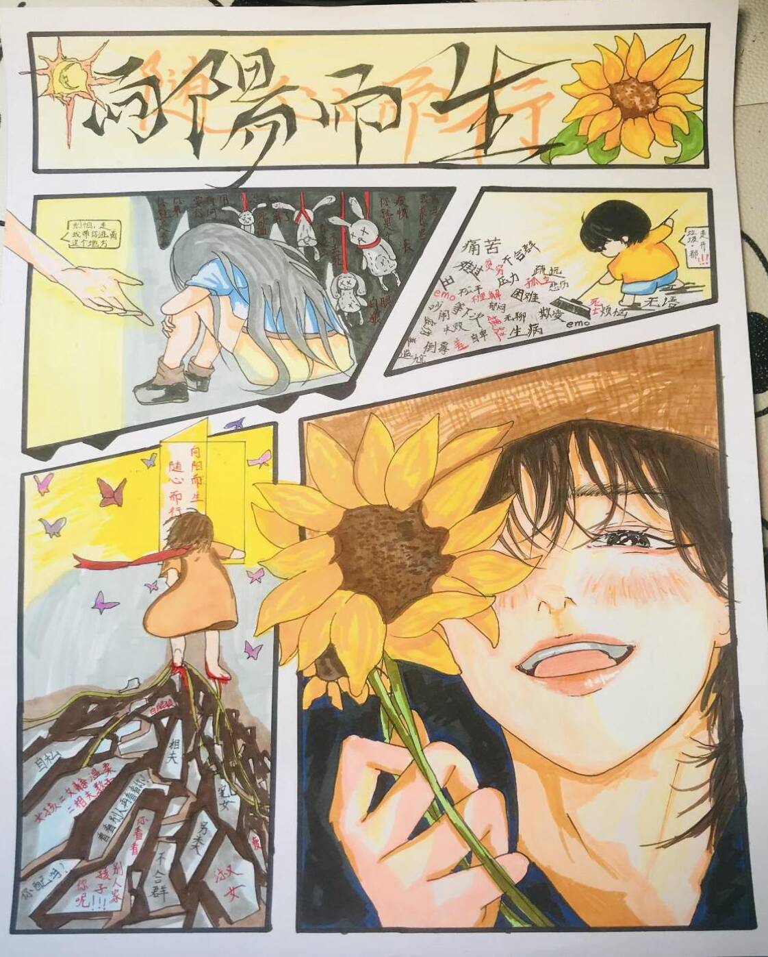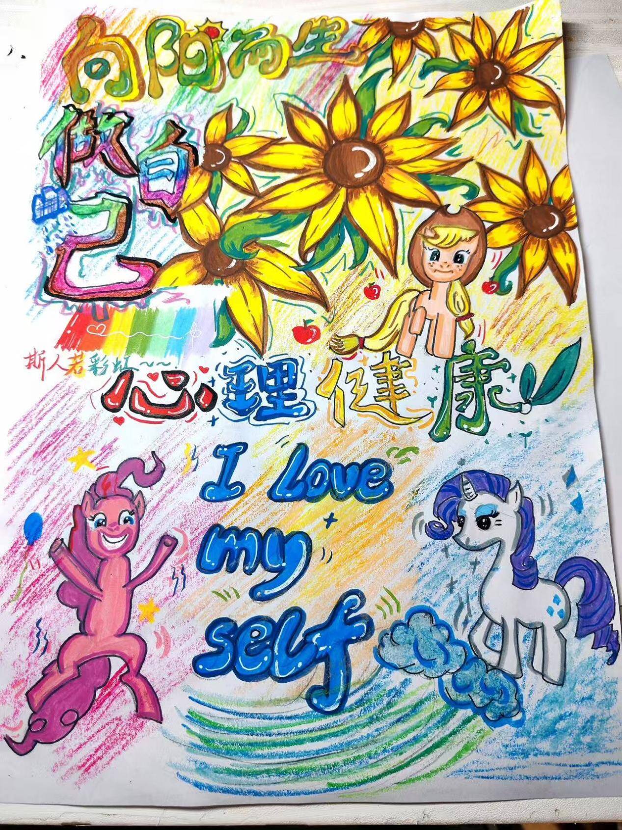 作品简介:这幅图画结合油画棒和马克笔两种涂色工具,运用向日葵,艺术字体以及小马宝莉来表达一种正向欢快的心情,目的是让看到这幅画的人感受到快乐,同时照应了主题“向阳而生”,“I love myself” 以及“做自己” 也是希望大家能够天天开心好好爱自己,相信自己是最棒的。
