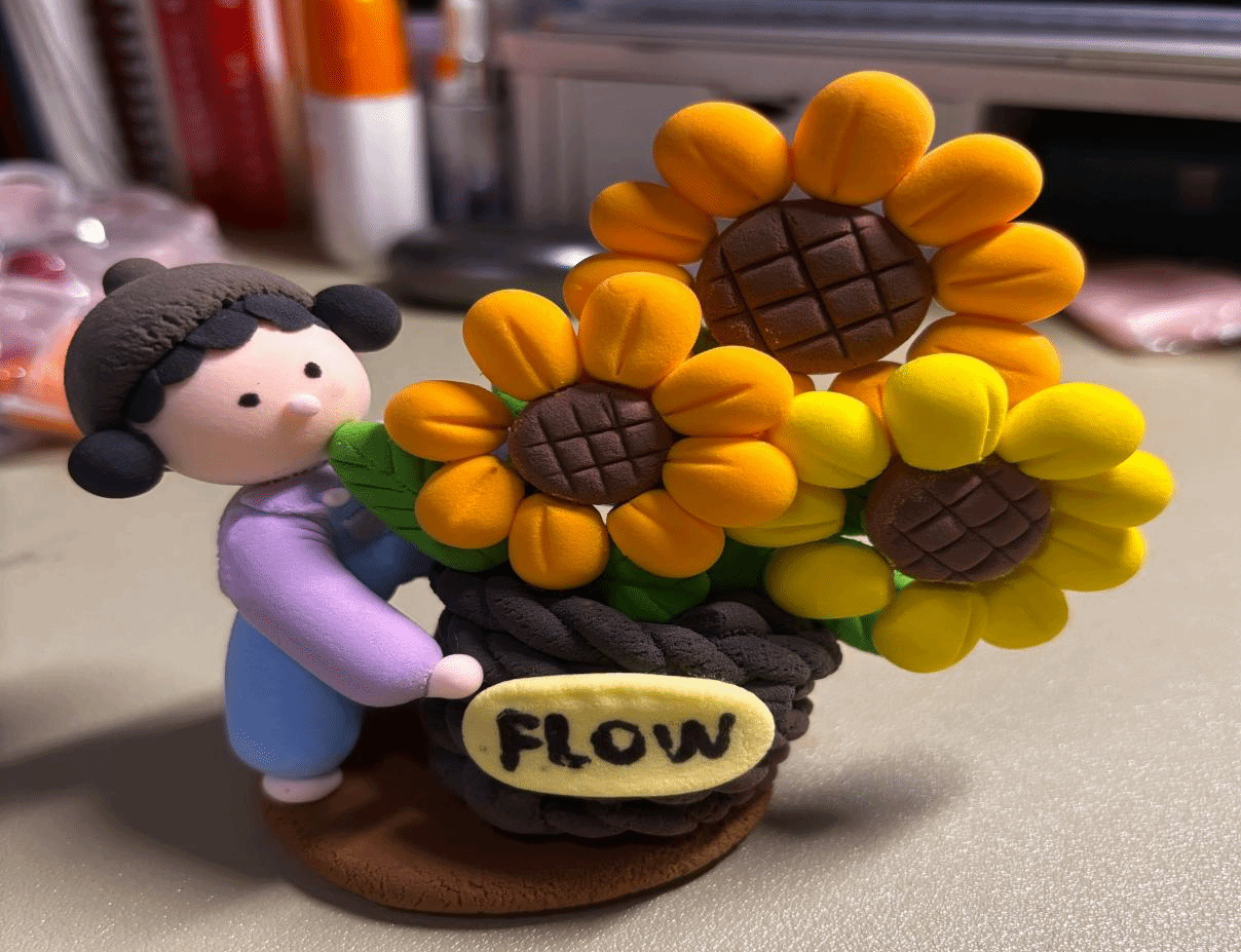 作品简介:本作品以超轻黏土为媒介,借由人偶与向日葵花束的艺术组合,构建对心理健康的具象化表达,传递 “接纳、陪伴、生长” 的心理成长内核。