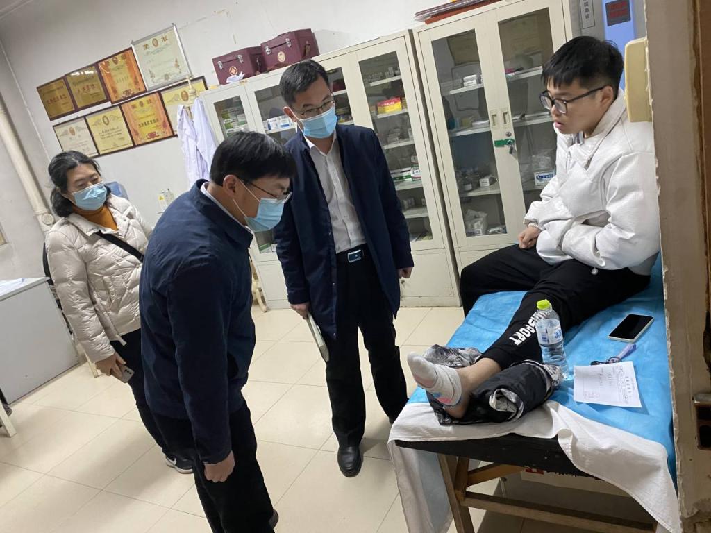 疫情阻隔了人与人之间的距离,却拉近了我们的心。2021级护理9班的尹楷文同学,在打篮球时不慎崴伤了脚,学院张延玲一行第一时间赶到校医院去探望尹楷文同学,询问伤势。王有娟和赵学超两位老师连夜送其到第二附院进行诊断、挂号、拍片、拿药,确认无大碍后,又将其送回宿舍,嘱咐好舍友注意事项,一切安顿好后,已是深夜。