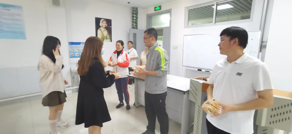 分发月饼过程中,辅导员们亲切地向每一位同学代表送上诚挚祝福,向护理学子们表达了浓浓真情和殷殷期盼。张延玲向同学们提出三点希望:一是注重传承和弘扬中华民族优秀传统文化,不断增强文化自信;二是志存高远,脚踏实地,德智体美劳全面发展,努力做具有山一大气质的优秀护理学子;三是常怀感恩之心,感恩党、感恩祖国,感恩父母、感恩老师、感恩同学,感恩每位帮助我们成长的人!在最后,张延玲再次祝愿全体护理学子中秋快乐。