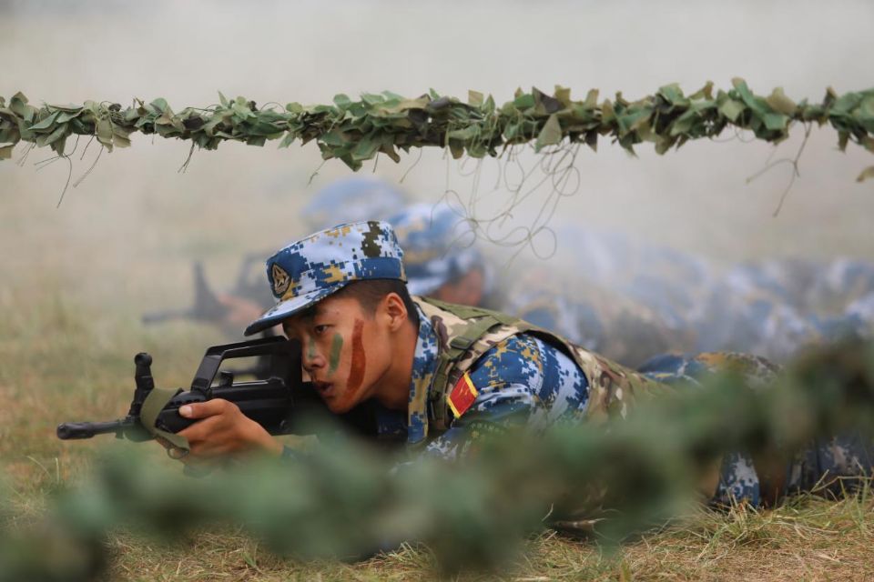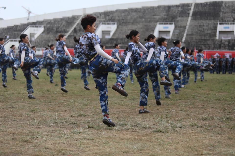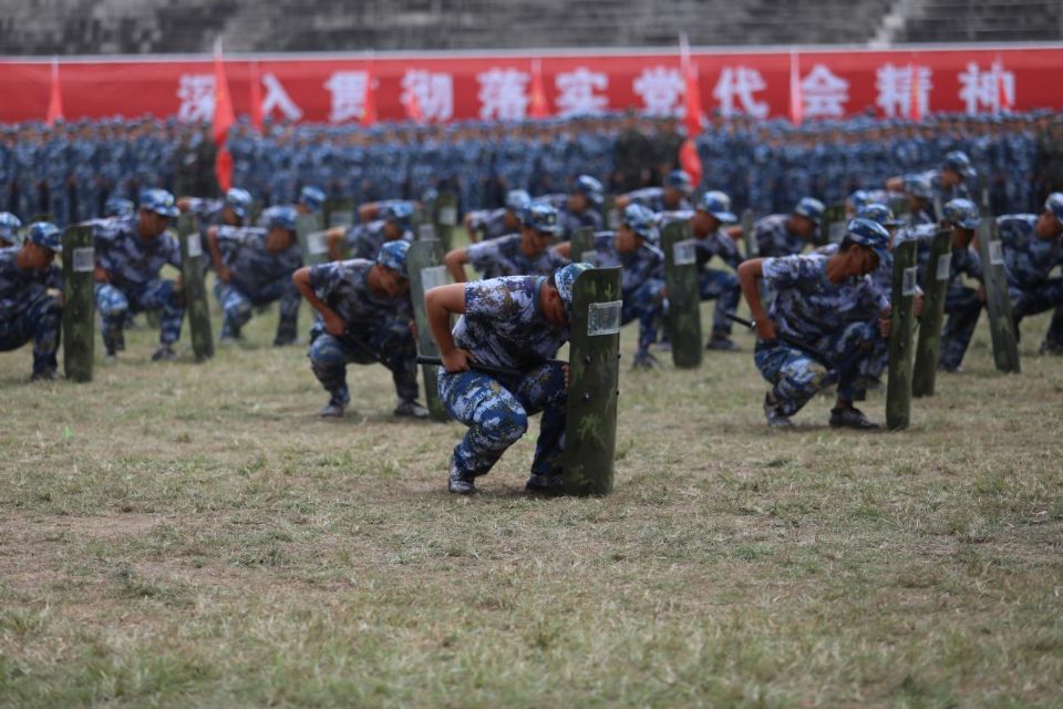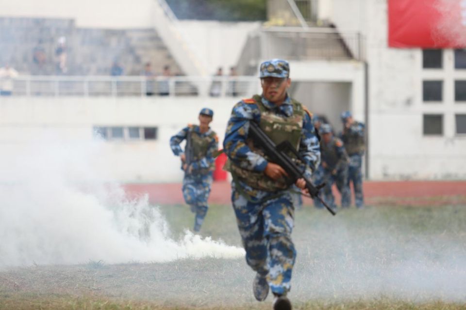 特战连的同学们英勇神武,尽显少年本色,警棍盾牌,操练整齐划一。突击连同学演绎红蓝两军对抗的场面,身穿迷彩服在烟雾中敏锐穿行,低姿匍匐、高姿匍匐、卧倒狙枪、生化防护、楔形队形、战伤救护等战术要领表演项目气势磅礴,尽显青春本色。