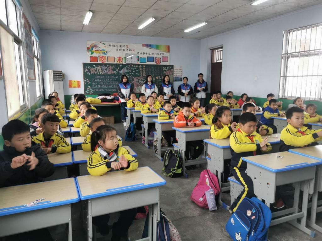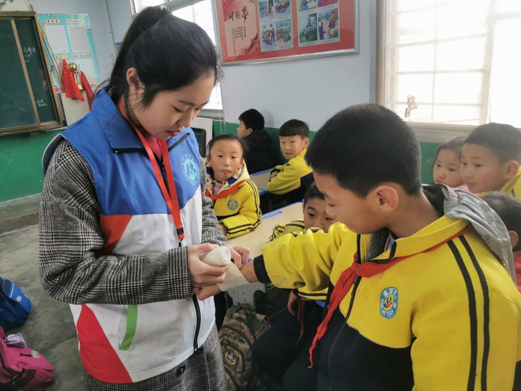 活动开始,南丁格尔志愿服务队队员李牧原向同学们普及卫生知识,以PPT的形式向同学们讲述如何预防感冒、如何正确洗手等卫生常识。讲解完毕后,队员张瑞雪进行专业操作演示。桑家疃小学学生认真听讲、积极互动,并在队员的指导下学习七步洗手法、配合演示包扎方法。此外,志愿服务队队员为现场教职工测量血糖血压。最后,队员集体合影留念。
