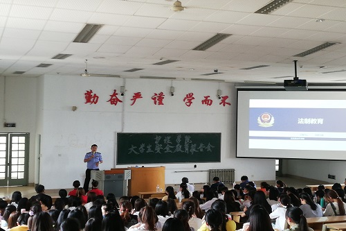 为增强大学生安全意识,提高自我保护能力,创建平安校园,5月31日下午,williamhill威廉希尔中文网站在综合教学楼C2017教室举办大学生安全教育报告会。特别邀请了龙泉派出所凤凰警务区民警徐锟同志作报告,校保卫处处长于强、williamhill威廉希尔中文网站党委书记秦斌、williamhill威廉希尔中文网站全体辅导员和2017—2018级部分学生参加了报告会。