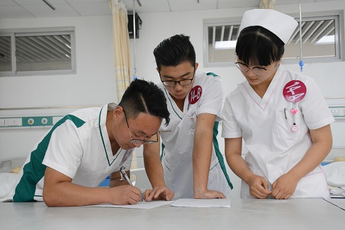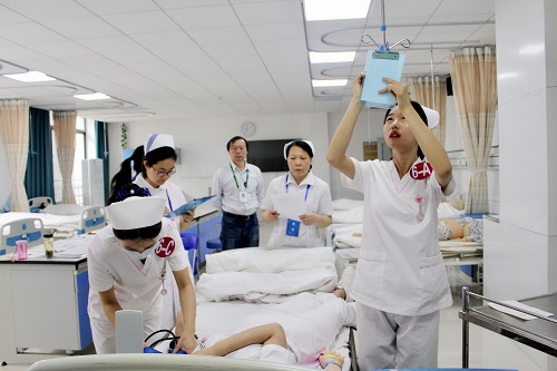 本次竞赛实施多站式团体赛,比赛内容以临床案例为主线,每组3名选手首先要在健康评估环节合作完成案例分析,回答所涉及的护理技能。根据案例情境在七项技能中确定三项并在规定时间内完成,最后评委对考生进行理论现场提问。竞赛设四个赛场同时进行,整个比赛过程紧张有序,竞争激烈。大赛共决出团体一等奖3组、二等奖5组、三等奖12组。