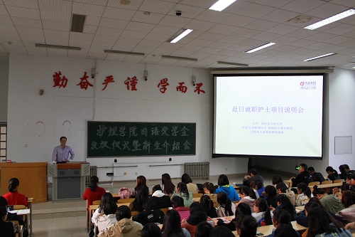 颁奖仪式上,秦斌书记和段存斌老师向获得二、三等奖学金的14名同学分别颁发了奖学金,共计8000元。颁奖仪式结束后,秦斌书记介绍了日语项目的优势及前景,鼓励同学们勇于走出国门,拓宽个人的视野,充分利用中日项目合作的机会,促进中日护理专业的交流。段存斌老师对项目背景、特点、参与条件、流程、优势等对赴日就职护士项目具体情况进行了说明,介绍了与育英馆教育集团合作的相关高校情况,并针对同学们提出的问题进行了一一解答。