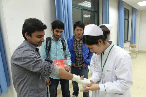 服务队员为留学生演示急救止血包扎技术