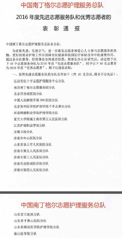 近日,中国南丁格尔志愿护理服务总队表彰2016年度在志愿服务活动表现突出的先进集体和个人。中国南丁格尔志愿护理服务队泰山医学院分队继2015年后,再次荣膺全国“先进志愿服务队”荣誉称号。此次共表彰了来自北京、河南、上海、江西、四川、山东等各地的40支志愿护理服务分队和50名优秀志愿者。