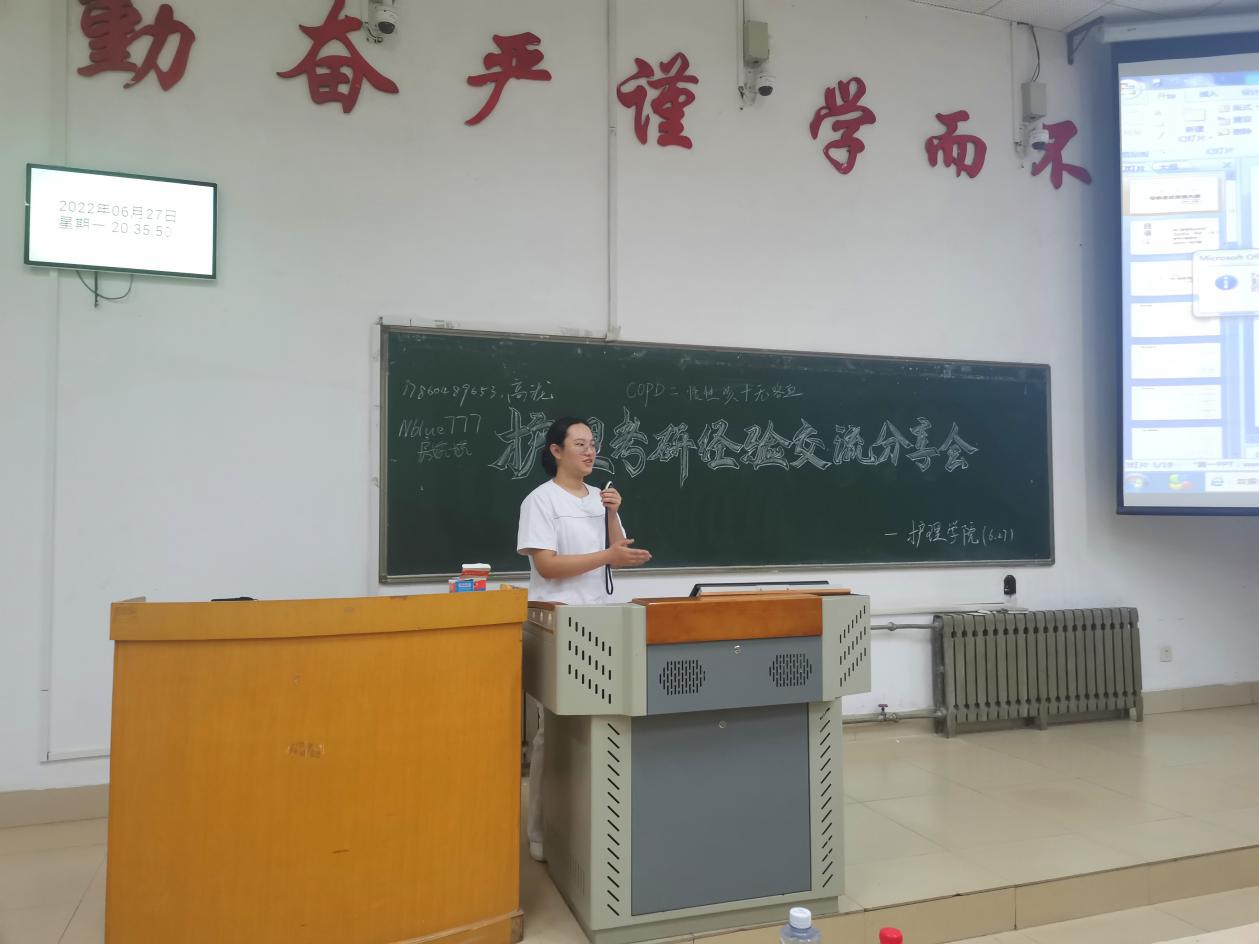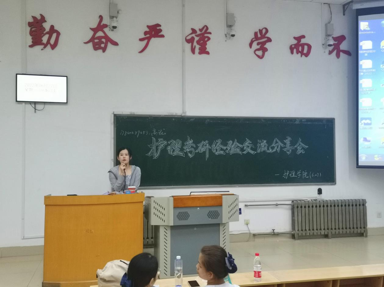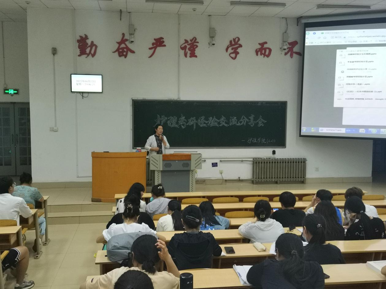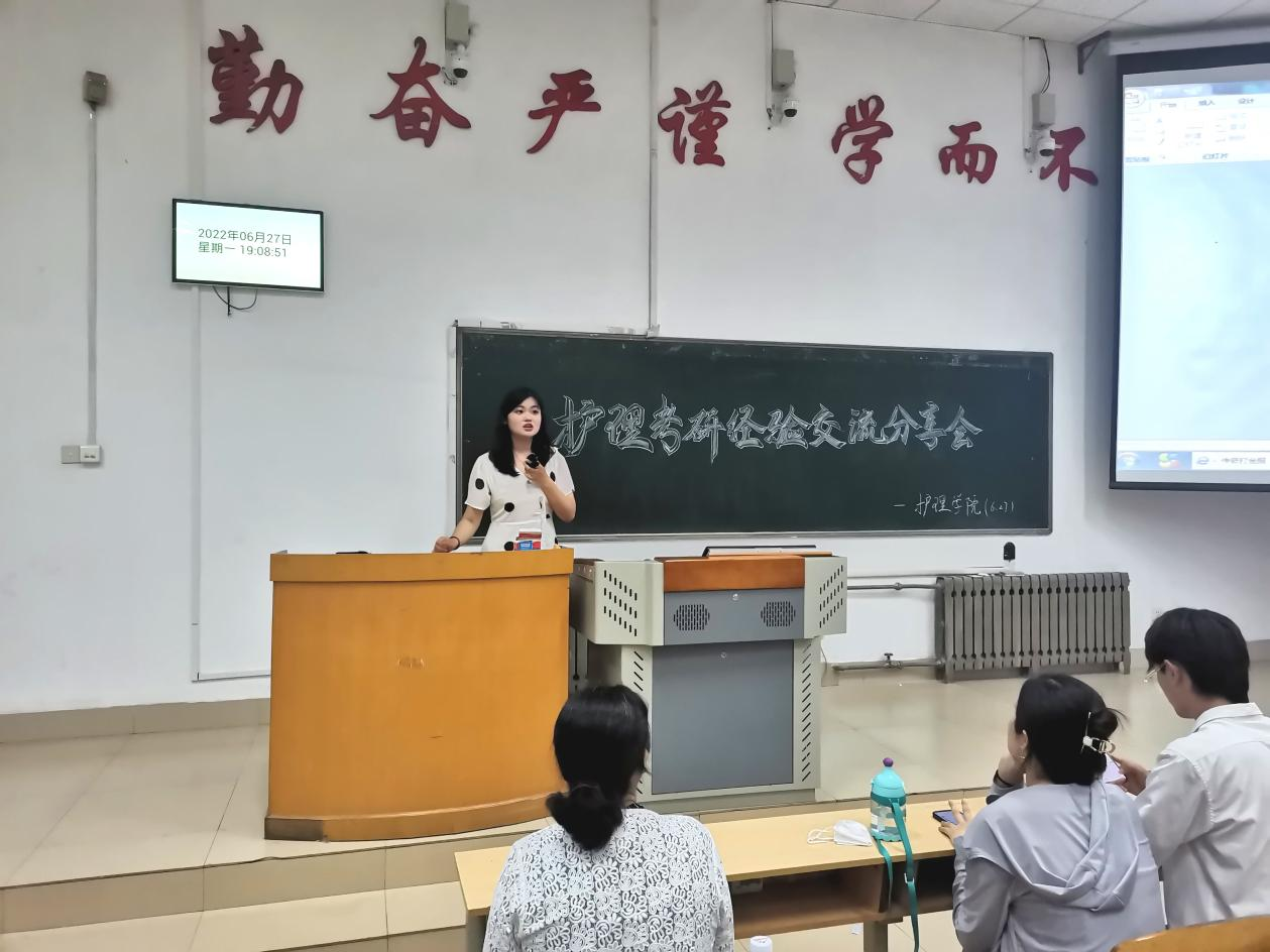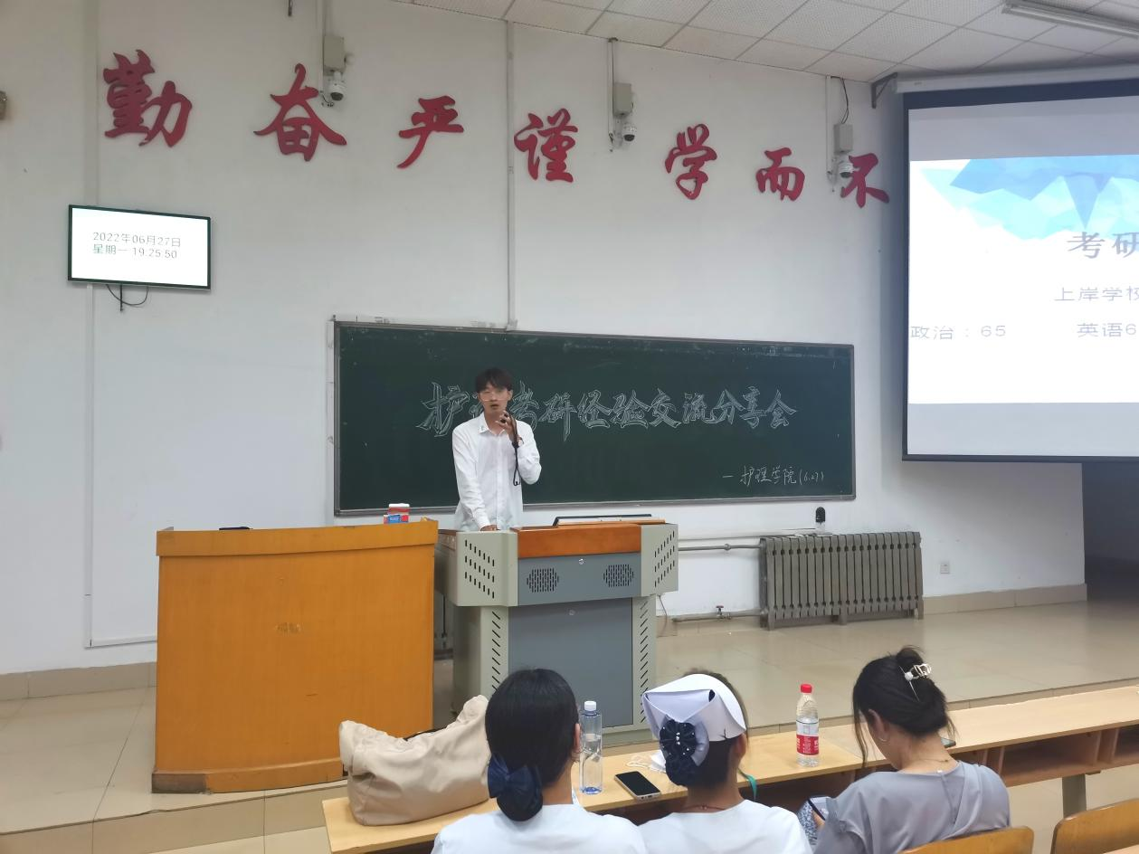分享会上,考取山东大学硕士研究生的李金潞、考取williamhill威廉希尔中文网站的高泷、考取复旦大学的房婉婉、考取上海中医药大学的孙丽薇等8名同学,分别从2021年研究生招收录取情况、考研学校的报考、考研科目的备考重点、各考研科目的学习方式、资料选择方法、如何合理分配考研与实习时间、学习计划的制定、自身心态调整、考研复试、复试调剂等问题做了详细的经验介绍。经验分享结束后,同学们积极提出自己关于考研的疑问,学长学姐们耐心地给予同学们解答。另外,学院参加2022年山东省护理技能大赛表现优异的同学徐继琳、王佳乐还为同学们做了技能大赛经验分享。