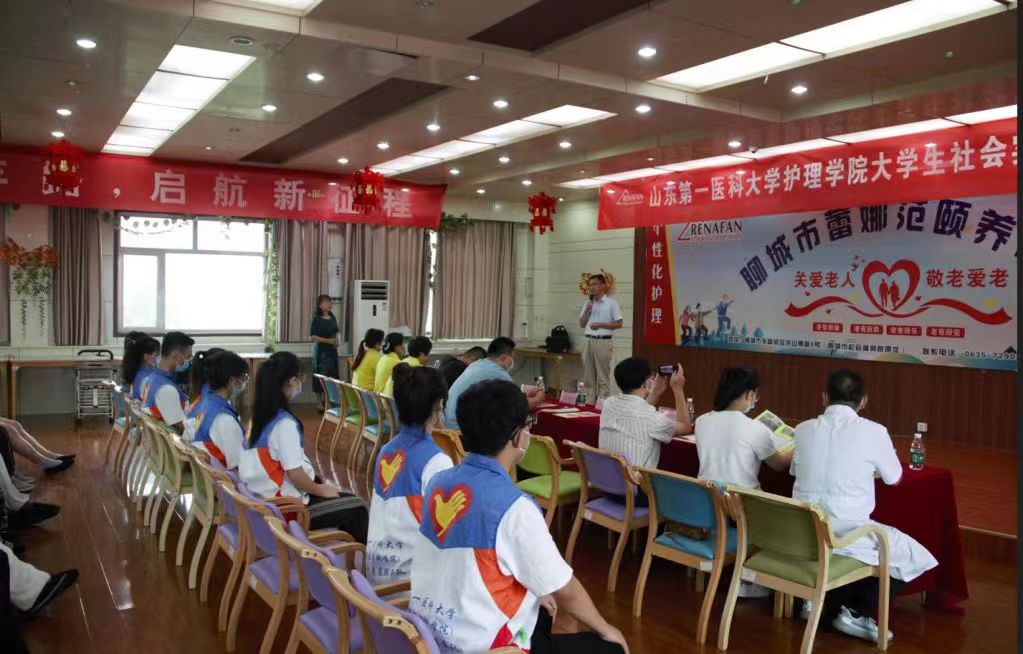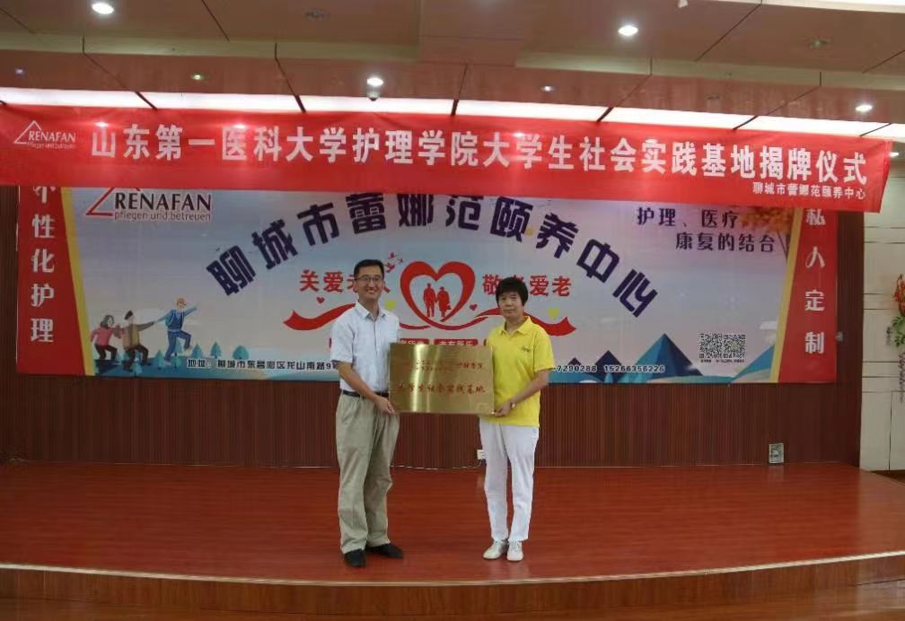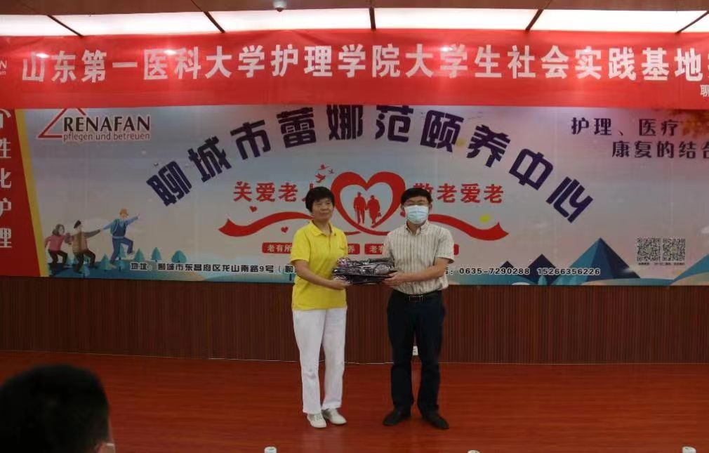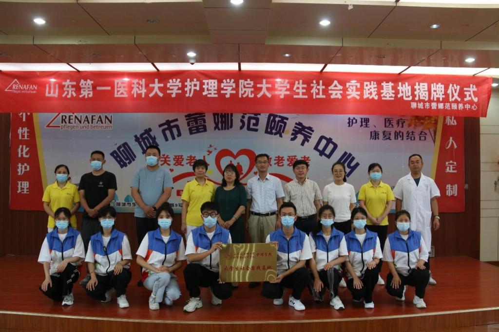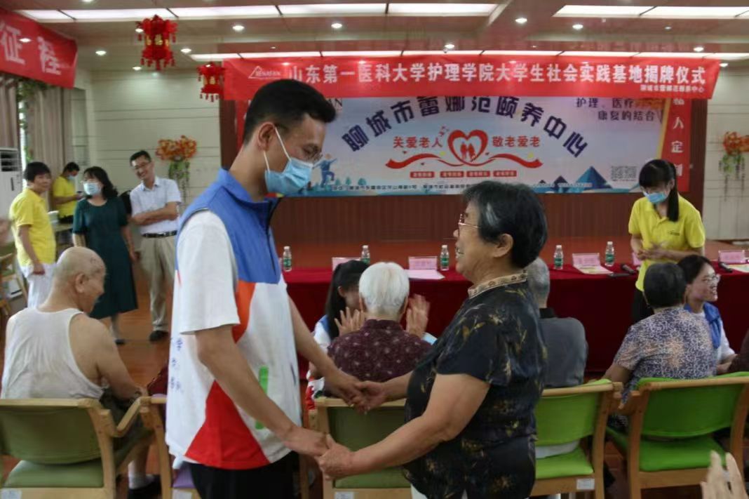 活动第一站,学院暑期“三下乡”社会实践服务团队来到聊城市蕾娜范颐养中心举行大学生社会实践基地揭牌仪式。仪式由孙爱玲主持,聊城市蕾娜范颐养中心院长贾青松、属地民政局同志董忠伟、王延虎及颐养中心老人代表50余人参加揭牌仪式。