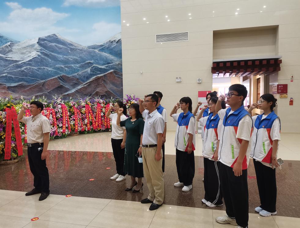 活动第二站,社会实践服务团队来到孔繁森同志纪念馆参观学习。学习活动通过“云直播”将线下开展与线上传播相结合,让广大护理学子在云端一起重走红色足迹。纪念馆内,师生列队向孔繁森塑像敬献花篮,表达对孔繁森同志的敬意和哀思。全体党员在塑像前举起右手,重温入党誓词。