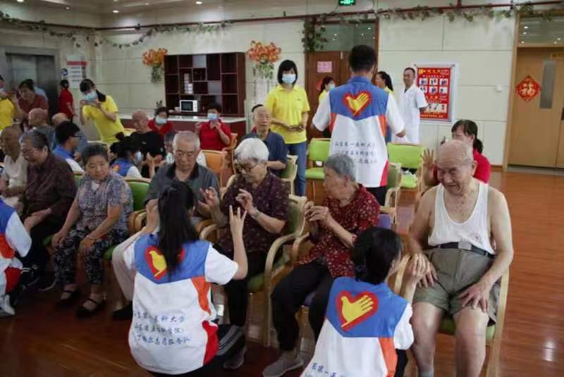 互动环节,社会实践服务团队队员们为老人们示范健身手指操等保健操,在满足日常保健的同时,还能起到预防阿尔茨海默病的作用。队员们一对一教老人们练习保健操,同学们一边示范,一边耐心地讲解每一个动作的要领,引导老人把肢体活动起来。同学们还和老人合唱红歌,关心询问老人的日常起居,普及健康知识等。老人们喜笑颜开、其乐融融,活动在欢歌笑语中结束。