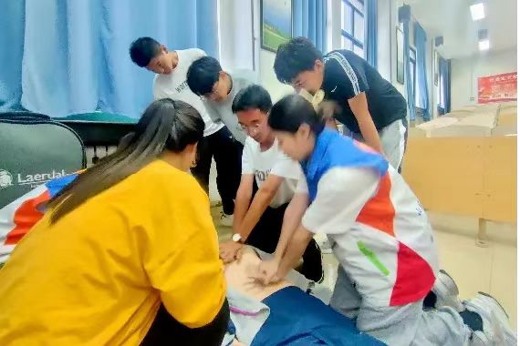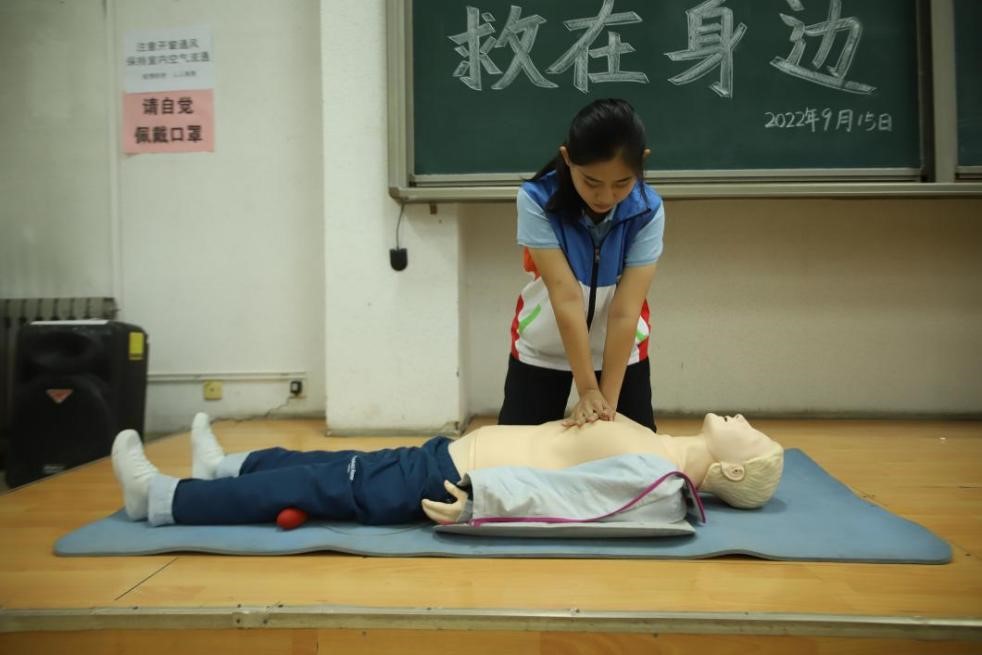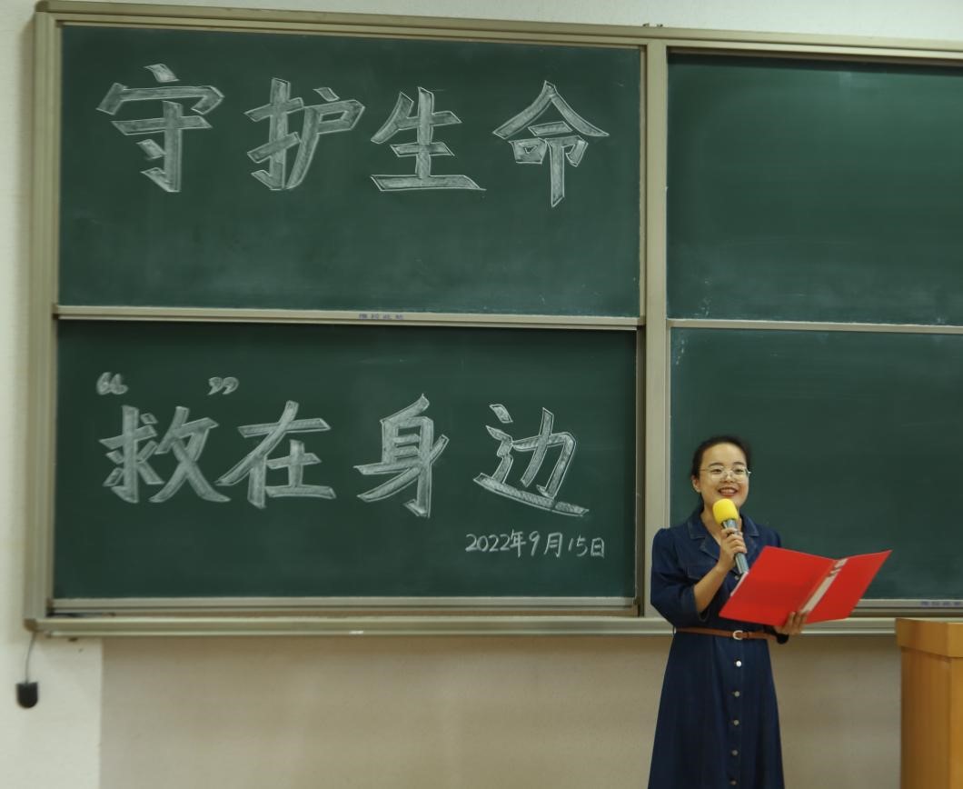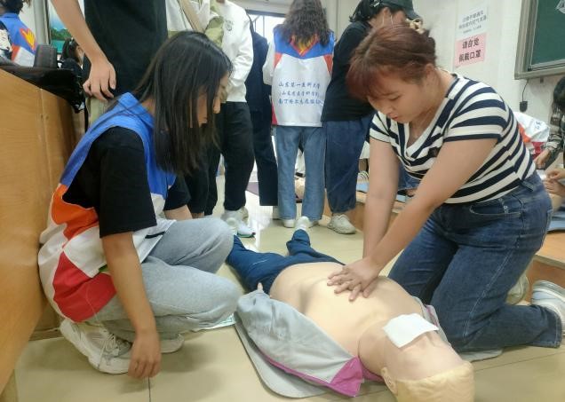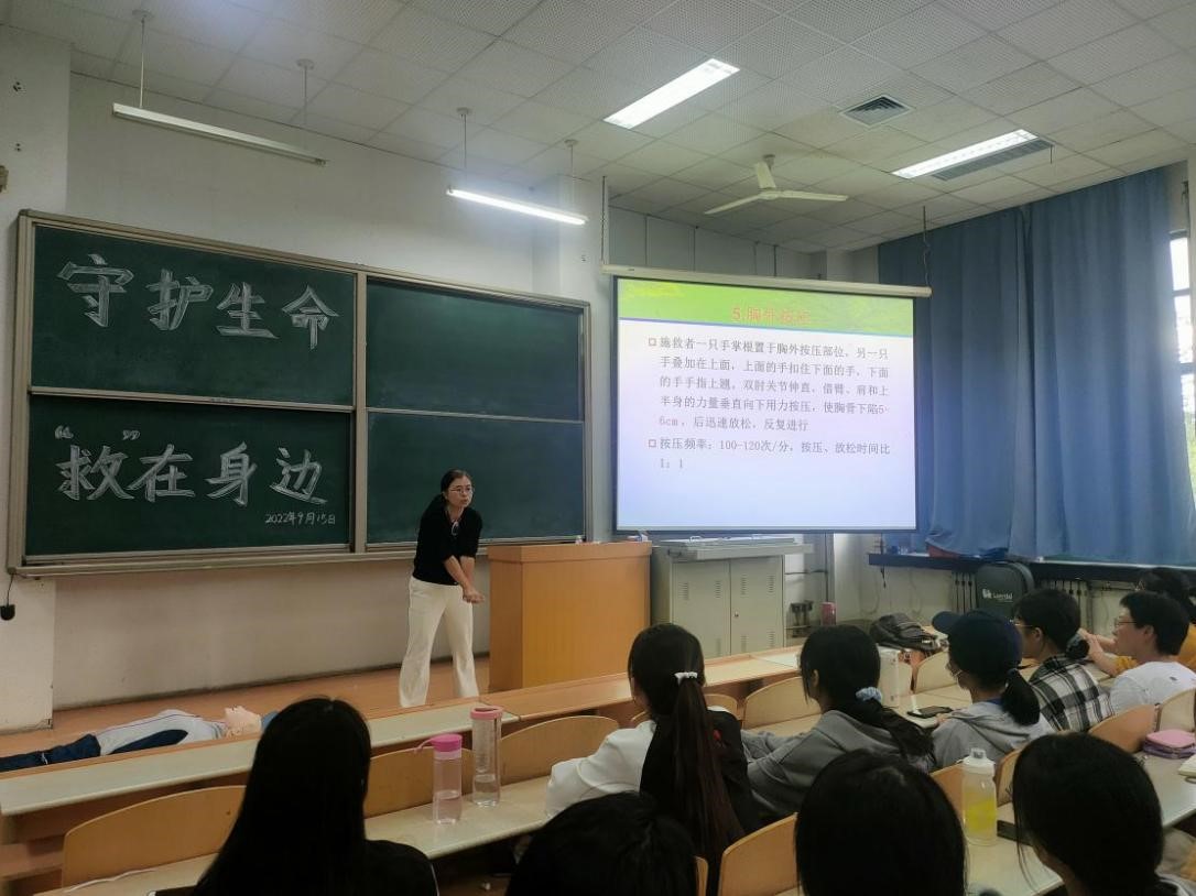 急救培训包括理论授课和实践操作互动两部分。在理论授课部分,孙霞老师为新生带来急救基础知识专题培训。她从大量猝死案例谈起,讲解了急救的基本程序和要点,着重介绍了徒手心肺复苏与人工呼吸的流程及注意事项。在互动提问环节中,同学们的积极性进一步得到调动,大家一边聚精会神听讲,一边认真做笔记。