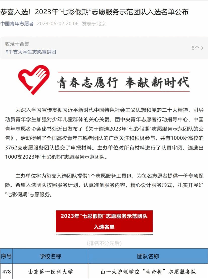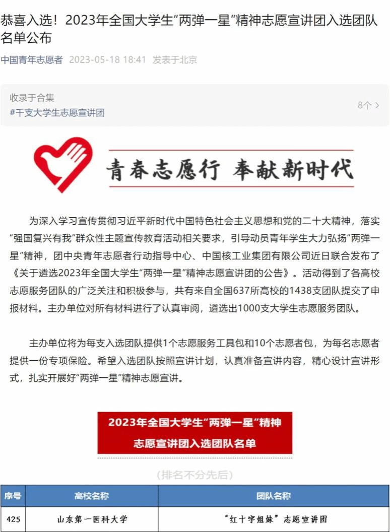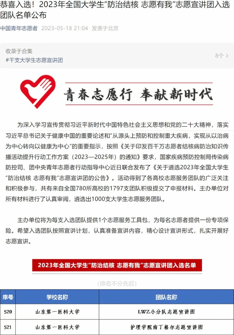 williamhill威廉希尔中文网站“红十字姐妹”志愿宣讲团入选2023年全国大学生“两弹一星”精神志愿宣讲团;南丁格尔志愿宣讲团、LWZ小分队志愿宣讲团入选2023年全国大学生“防治结核 志愿有我”志愿宣讲团;“生命树”志愿服务队入选2023年“七彩假期”志愿服务示范团队。