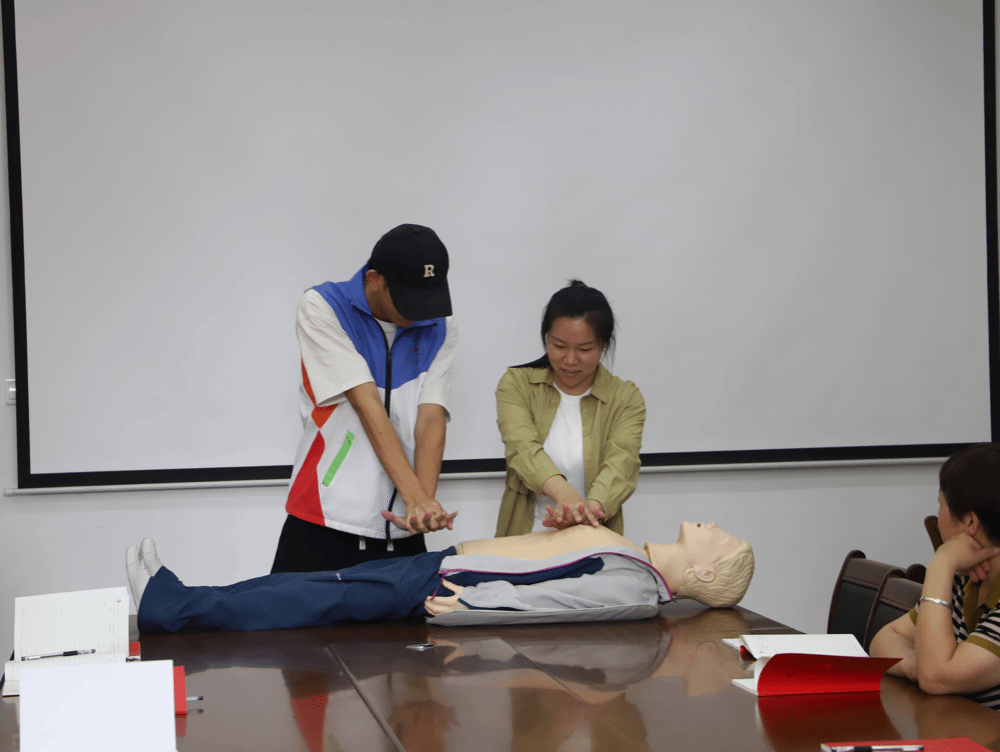 第三板块中,队员利用假人进行了单人成人心肺复苏的全过程演示,队员熟练、专业的操作得到了全场的认可,现场赞声连连。演示完毕后,还邀请了在座的观众一起练习相关的操作,加深了他们的印象。