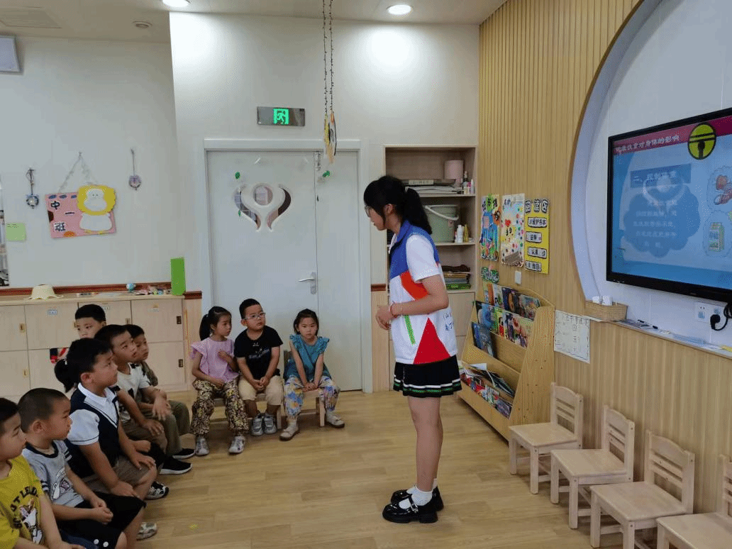 为深入学习贯彻习近平新时代中国特色社会主义思想,引导和帮助广大青年学生在与现实相结合的“大思政课”中“受教育、长才干、作贡献”,丰富少年儿童的暑期文化生活,加强对儿童身心发展的关心关爱,近日,山一大williamhill威廉希尔中文网站“生命树”志愿服务队前往泰安市尊岳智慧幼儿园继续开展“七彩假期”暨暑期“三下乡”社会实践活动,针对“生命树”中“心理”枝干中的“性教育”侧枝和“生理”枝干中的“饮食健康”侧枝展开科普。