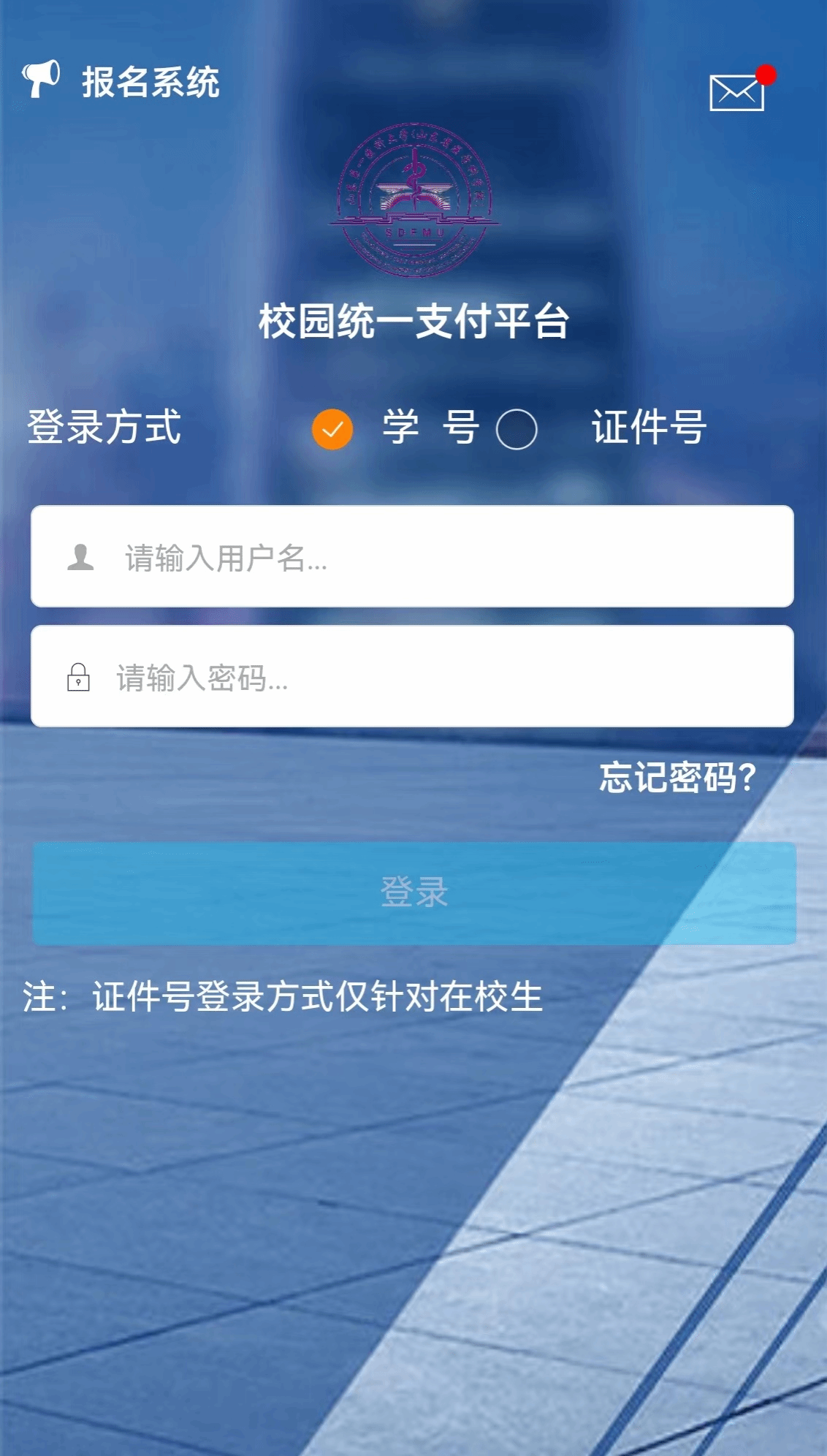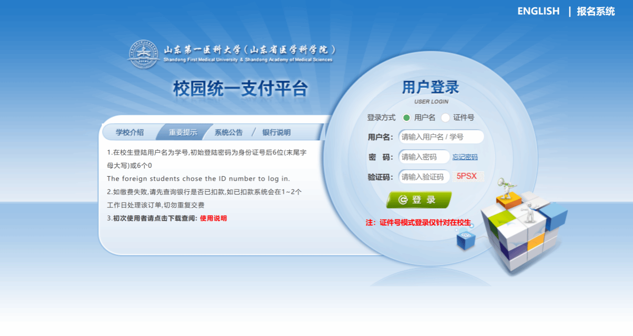 登陆方式为用户名登录。用户名为学号,新生初始登录密码为身份证号后6位(最后一位为X的,输入大写X)或6个0。