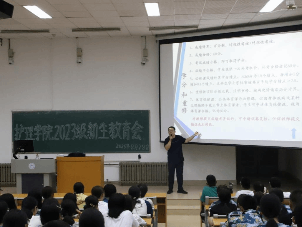 房建强从教务部的主要职责入题,将教学管理入学教育讲座分成四个部分,详细介绍了各科室面向学生各方面的相关规章制度。他为同学们详细讲解了教育在线管理系统的使用方法,具体介绍了选课各阶段的规则和注意事项、教材订购途径、学分和重修、考试纪律等新生须知,叮嘱新生要根据自己对未来的规划合理选课,强调研读培养方案的重要性,建议新生及时关注教务部下发的通知,仔细阅读新生入学手册,以便更加全面地了解教学上的相关规章制度。