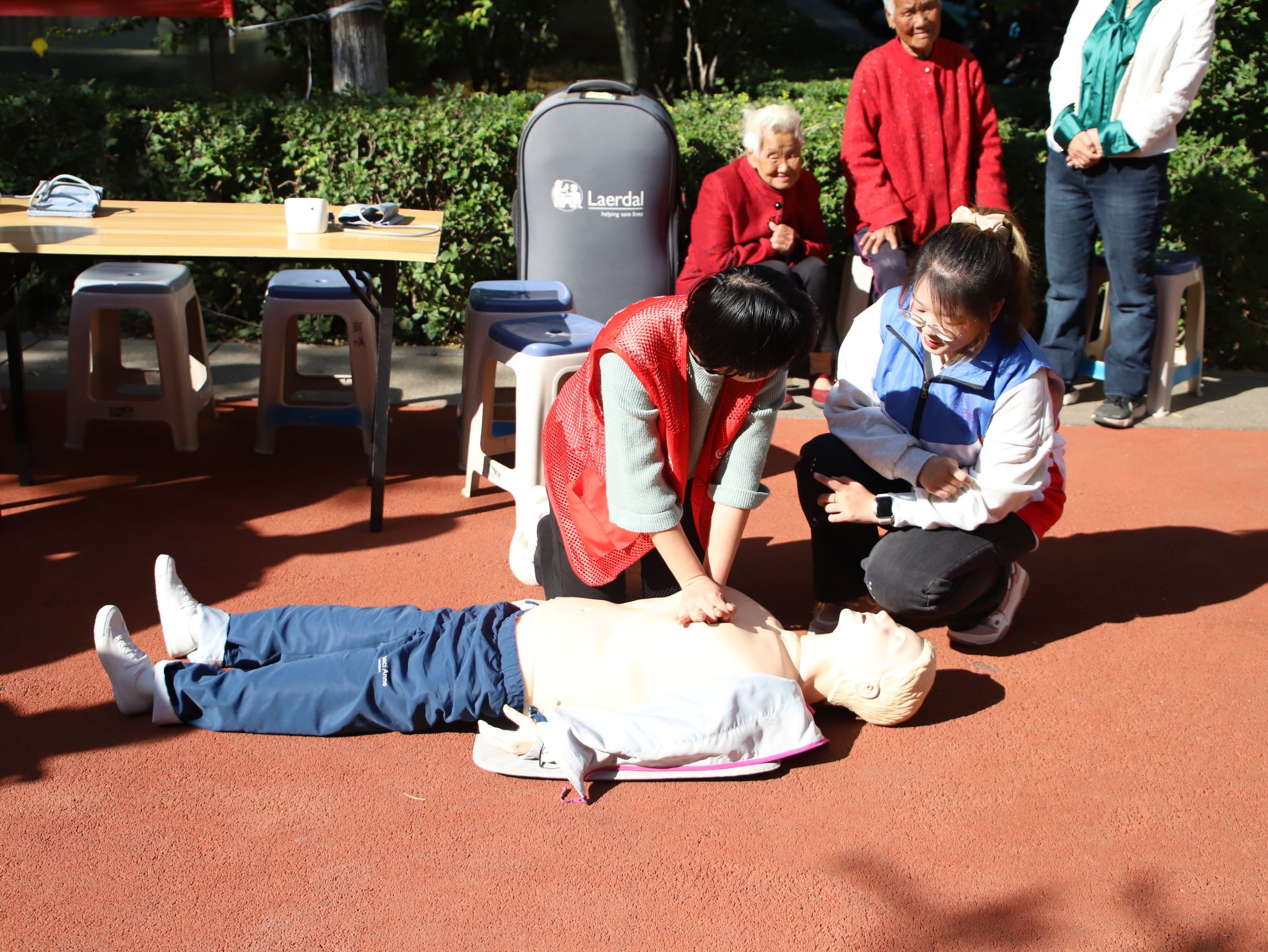 活动当天,队员们提前到达社区,布置活动场所、准备演讲内容以及摆放各种检测仪器。活动伊始,队员们首先为社区老人进行量血压、测血糖的常规活动。为帮助社区老人及其子女了解心肺复苏的基本操作及其重要性,队员们还利用PPT对单人心肺复苏的操作方法和注意事项进行了生动的讲解,并借助人体模拟教具更直观地演示了实际操作,进一步加深了他们对心肺复苏的认识。队员们认真负责的态度得到了老人们的广泛好评,最后在欢声笑语中结束了本次志愿活动。