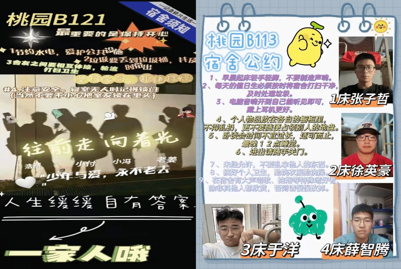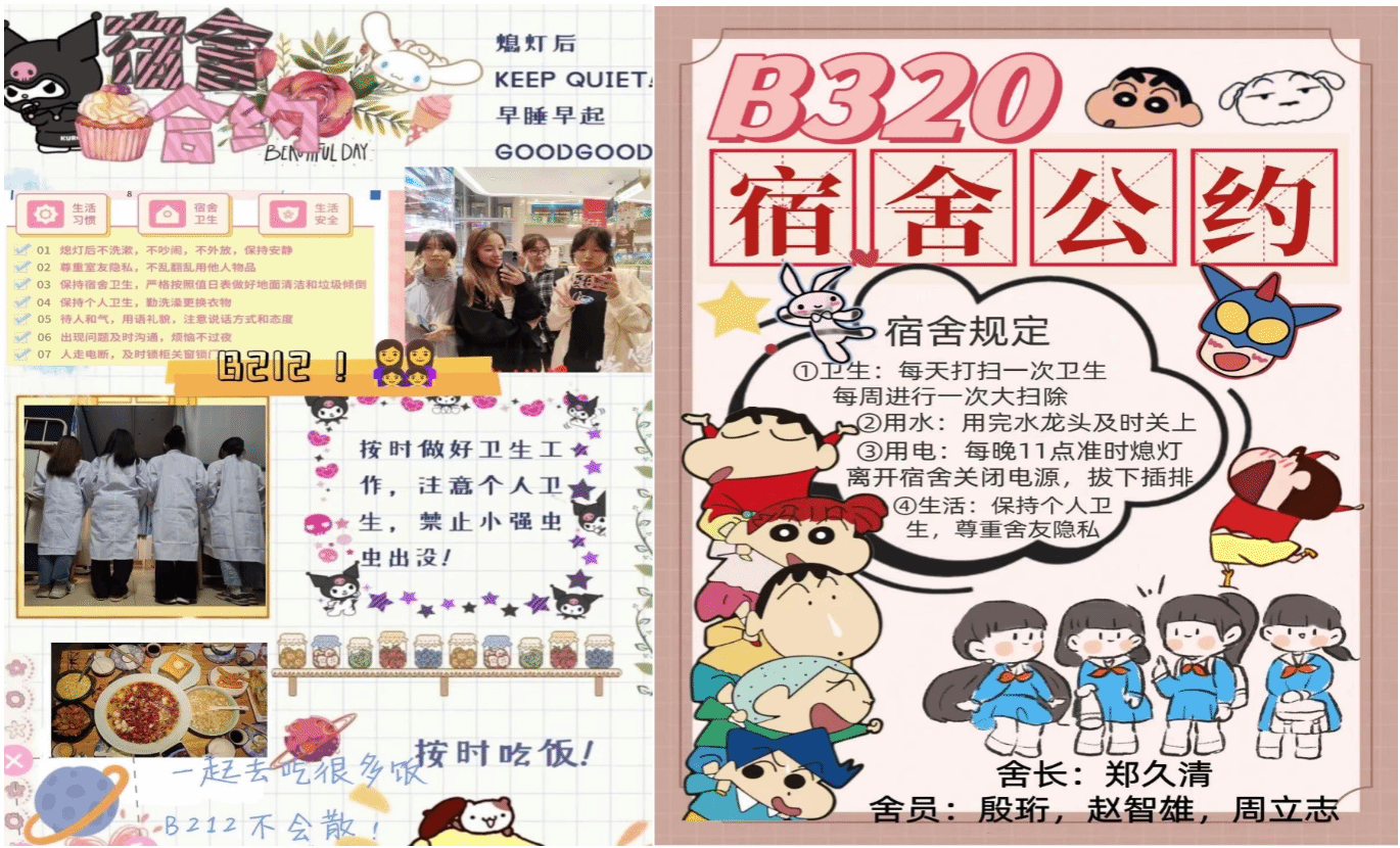 在整个评比过程中,各个宿舍风格多样,新颖性与时代性兼备,同时还融入了一些创新观念。女生宿舍公约温馨雅致,男生宿舍公约简洁大方。现在就让我们一起来欣赏一下吧。