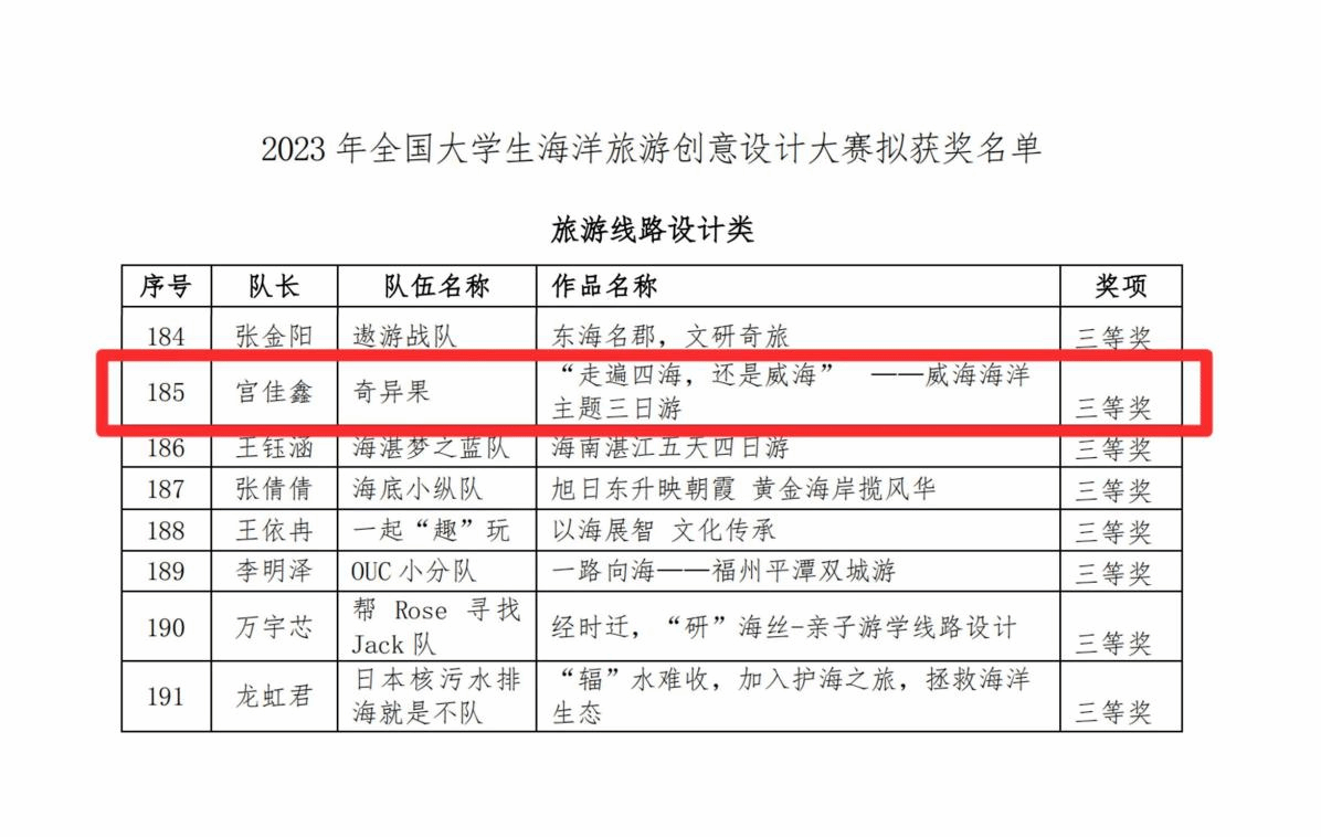 近日,2023全国大学生海洋旅游创意设计大赛拟获奖名单公布,williamhill威廉希尔中文网站学子精心设计的参赛作品在比赛中喜获三等奖3项。