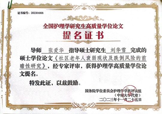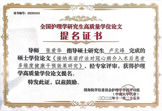 为拓宽学院教师及研究生学术视野,加强学科建设、提升护理研究生的培养质量,在张爱华院长带领下,本次大会williamhill威廉希尔中文网站共有6位教师及研究生参加。前期由教育部护理学学科评议组开展的“高质量学位论文评选工作”也在本次学科建设大会上公布了评选结果。本次评选收到了全国近70所院校,2020届至2023届硕博学生的232篇优秀硕博论文,其中博士论文73篇,硕士论文159篇,共评选出24篇高质量博士学位论文,48篇高质量硕士学位论文。我学院共选送4篇硕士学位论文参与评选,其中张爱华导师指导的卢元峰、刘华雪2位护理学硕士研究生的学位论文获评高质量学位论文提名奖。